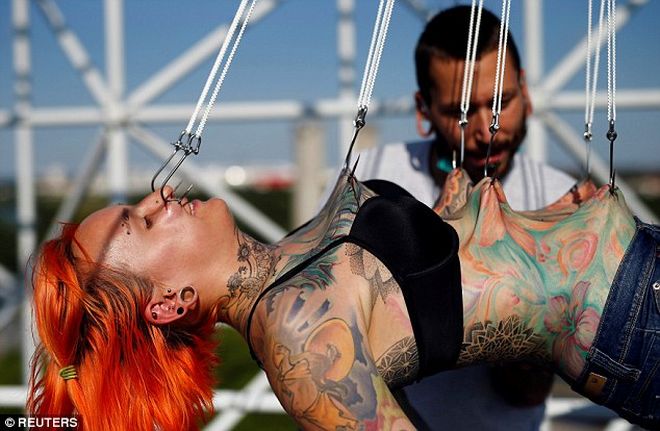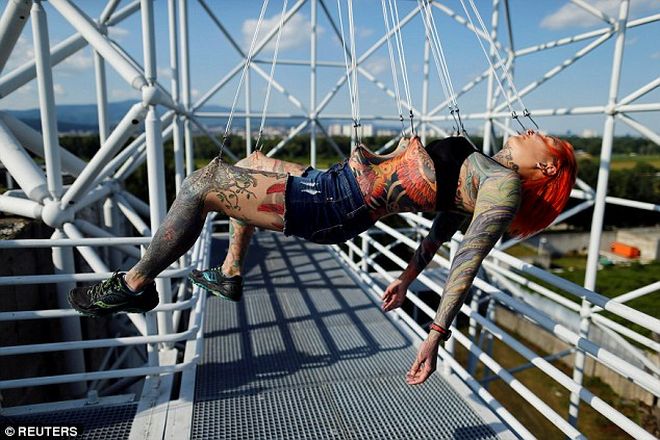 Доброволни от Хърватия тестваха прага си на болка чрез екстремна нова форма на боди пиърсинг. На покрива на една от високите сгради в Загреб, един от местните специалисти по пиърсинг, Дино Хелвида, прониза тялото и лицето на една от своите клиентка Катлийн с множество куки.