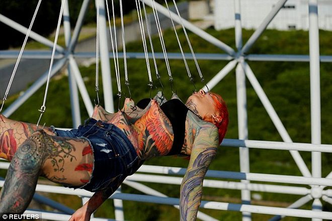Хелвида, който е професионален специалист по боди пиърсинг от Босна и Херцеговина, и практикува от 6 години, е бил подпомаган от своята приятелка Зорана. Тя първо е пробила кожата на клиентката с игли, прекарвайки след това под нея метални куки, свързани с тънки въжета. Чрез тях татуираната девойка от снимките е била издигната в хоризонтално положение, висейки на собствената си кожа, пише "Дейли Мейл".