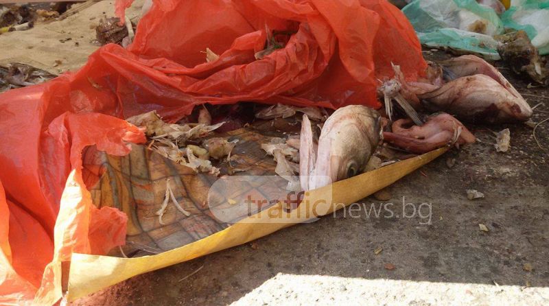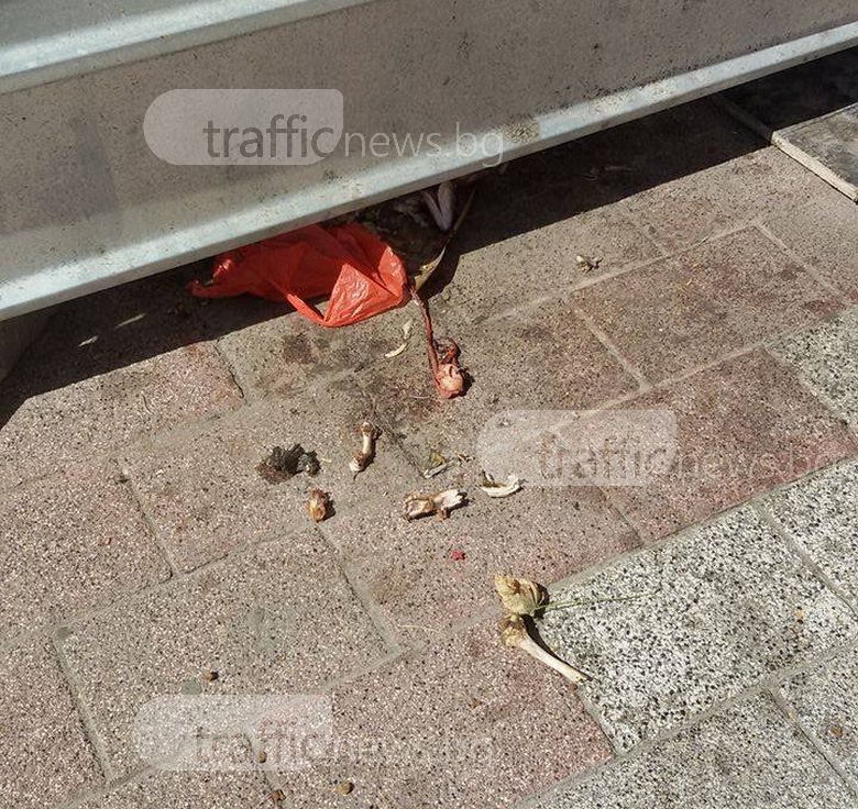 Рибешки главички и други “морски дарове“ се търкалят на площад „Стефан Стамболов“, след като някой от близките заведение е решил да изхвърли останките зад ремонтни ограждания, опасващи къща на ъгъла на ул."Патриарх Евтимий". Дали намеренията са били да бъде нахранена някоя животинка, ние не знаем, но пък котки веднага надушиха менюто и го примъкнаха на видно място, само на метри от Община Пловдив.