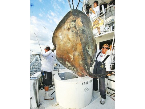 След като го закачил на около 15 метра дълбочина по време на риболов с японски телевизионен екип, капитанът се борил в продължение на четири часа, за да извади гигантския си улов на повърхността, преди да направи снимка и да го освободи обратно в океана.