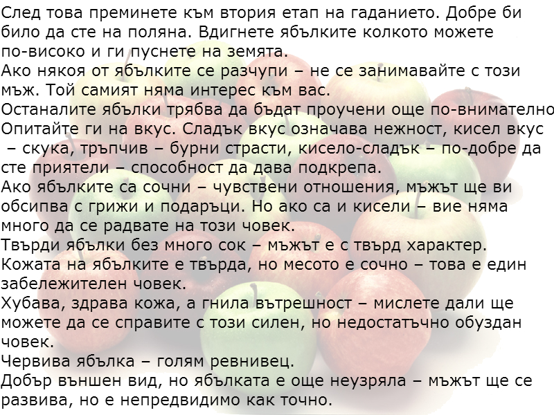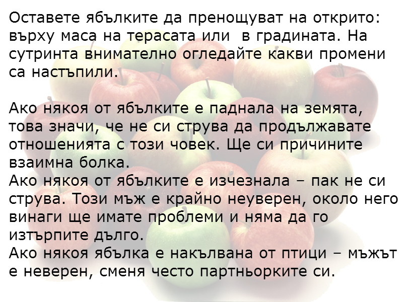 За целта ви е нужна една ябълка или пък няколко, ако искате да гадаете за повече от един мъж – за всеки по един плод. Това, което трябва за знаете е, че ябълките не трябва да са купени от магазин, а откъснати от дърво. Не избирайте ябълки с идеална форма. Откъснете първите, който ви харесат.