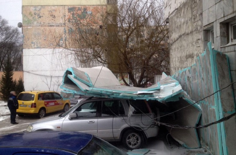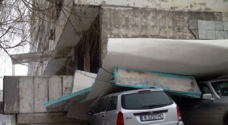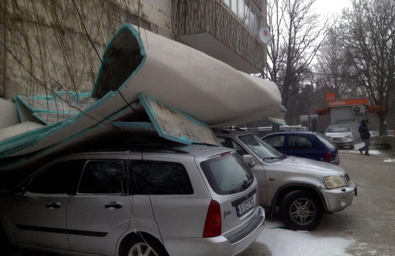 Ураганен вятър вдигна изолацията на блок във Варна, стовари я върху коли (СНИМКИ)