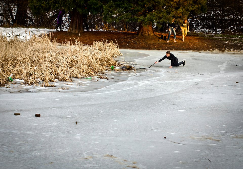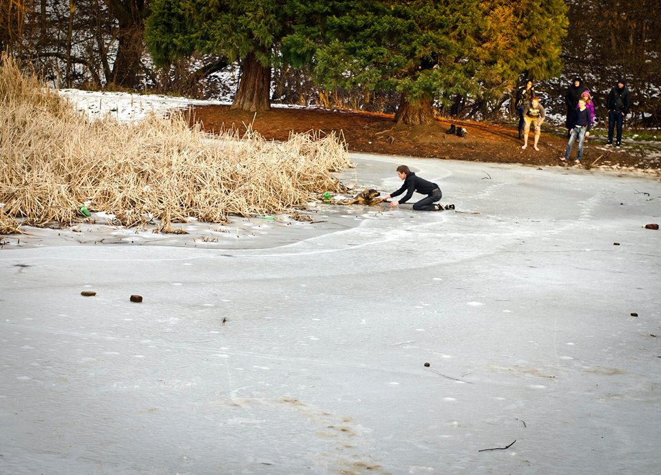 "Днес се разхождахме в южния парк, когато станахме свидетели на затрогваща случка, която ми възвърна позитивизма по отношение на днешните тийнове. Считаме, че почти аксиоматично те са келеши или кифли, които газят през трупове за да постигнат каквото искат в момента и за никой и нищо не ги е еня, но ето, че имало и свестни деца! Та на случката: както си ходехме, аз с кенгуруто и Невена в него, а Лили до мене бута количката - аз забелязвам един келеш, който си събува обувките и чорапите и се гласи да прави някаква магария на замръзналото езерце, там, до недостроената черква, срещу Луи Айер, сещате ли се? В следващия момент забелязвам, как едно бяло куче се мотае около тръстиките в центъра на езерцето и нещо се държи странно... с вглеждане виждам, че друго куче е пропаднало през леда и се опитва да излезе, а не може. И бялото куче, и пропадналото куче не бяха домашни - нямаха каишки и бялото трудно можеше да бъде определено като "бяло" на цвят...Групичката тийнове се събуваха и събличаха в явен опит да помогнат на помияра. След кратък размисъл излъчиха най-лекия от тях, който запълзя на четири крака по леда, взел клон, към кучето... тогава се сетих, че нося апарат. Извинете фотографа - той толкова си може, а децата заслужават дебели адмирации за постъпката си! Имало свестни деца! Дано не избягат..."