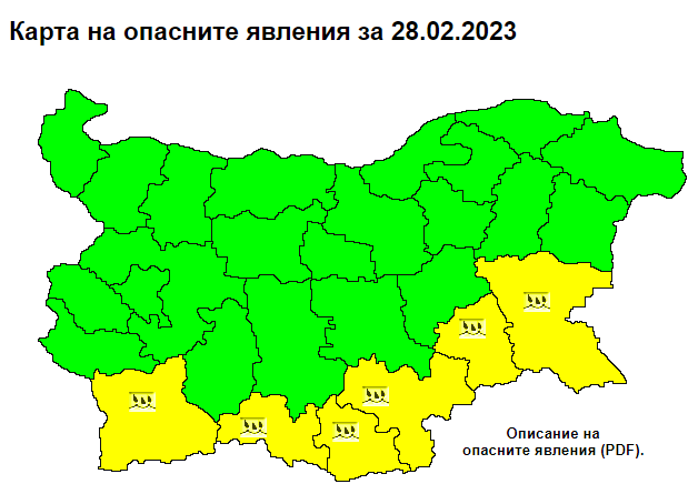 През нощта на много места продължи да вали, но до сутринта в повечето райони валежите ще спрат. Минималните температури през днешния ден ще са между 3° и 8°, в София - около 4°, а максималните от 4° до 16°. Вятърът ще се ориентира от изток-североизток и ще е слаб до умерен. Преди обяд ще превалява само на отделни места, но около и след обяд от юг валежите ще се активизират и до края на денонощието ще обхванат почти цялата страна. Предупреждение за значителни количества е обявено в южните райони.
