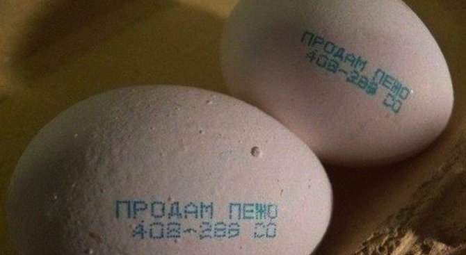 Мъжът, за когото се твърди, че е ръководител на неназована птицеферма, е използвал собствената си продукция, за да се опита да пласира изгодно возилото с марка „Пежо”, съобщи руското издание „Миасский рабочий”. Вместо обичайния печат за трайността на кокошия продукт клиентите могат да видят текста „Продавам „Пежо”, след който е поместен шестцифреният телефонен номер на собственика.