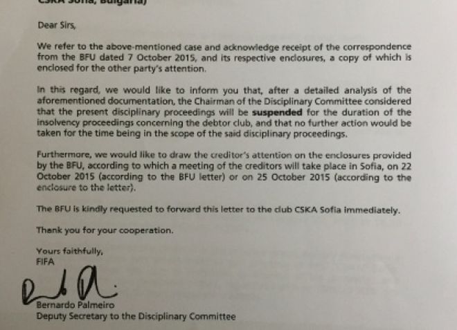 В писмото на ФИФА (Виж документа.) се казва също така, че ФИФА ще обърне внимание на всички кредитори за насроченото събрание на кредиторите в София. Писмото е подписано от заместник-секретаря на Дисциплинарната комисия на ФИФА Бернардо Палмейро", пише БФС.