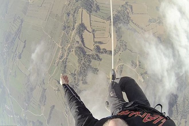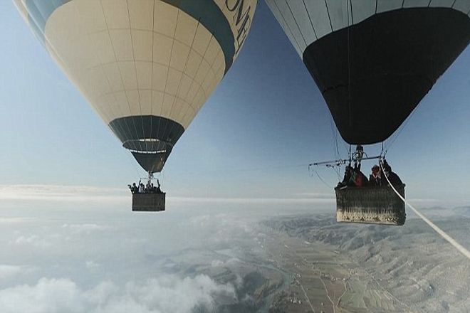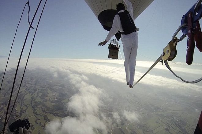 Група френски акробати заснеха уникално видео с опита си да поставят рекорд за ходене по въже на най-високо разстояние от земята. "Скайлайнерс" се опитаха да преминат до въже опънато между два балона, които летят на огромна височина над земята.