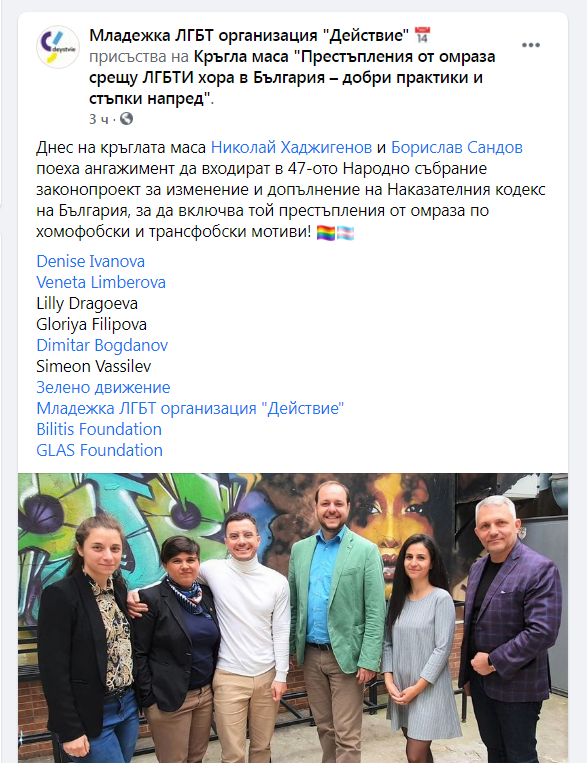 Хаджигенов и Сандов се похвалиха, че са били днес на кръгла маса заедно с ЛГБТ организацията „Действие“ и са поели ангажимент за допълнение на Наказателния кодекс.