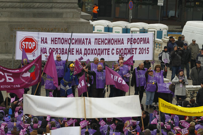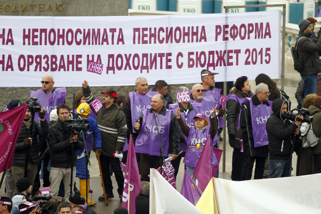 Хиляди синдикалисти от КНСБ удържаха на обещанието си да излязат на протестно шествие срещу Бюджет 2015 и срещу предложението за поредното вдигане на пенсионната възраст и стаж с 4 месеца.