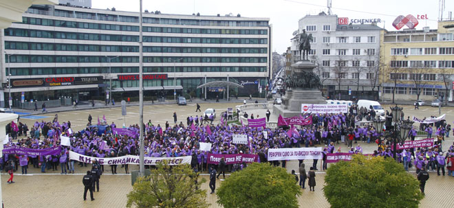 Облечени в лилаво и развели десетки български знамена, протестиращите тръгнаха от столичния пл. „Македония" и се отправиха последователно на протестно шествие първо пред Министерския съвет, а после пред Народното събрание.