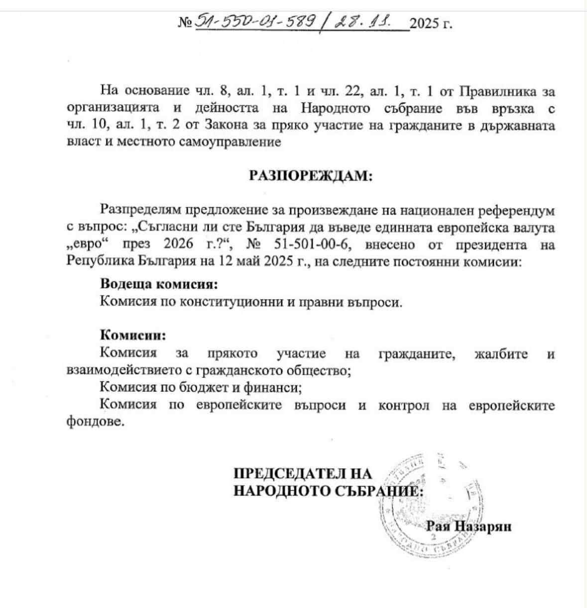 Рая Назарян е пуснала предложението на президента за референдум за еврото. Хитър тактически ход на Бойко и упралвяващите, който искаше да представи протестите като такива против еврото, а ГЕРБ като защитник на еврото.