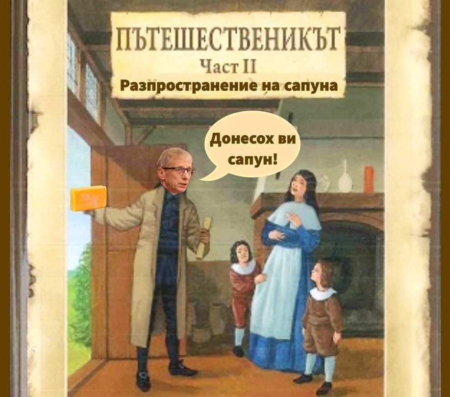 "Изяде дядо самунче, наду се като паунче, захвърли бързо бастунче, на двора вади сапунче", гласи забавният текст към колажчето, на което ротационният премиер и държавен екскурзиант бърка сапунена смес.