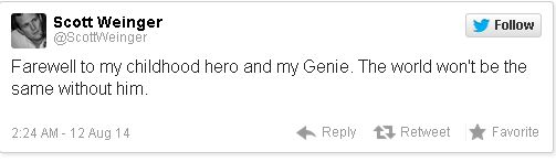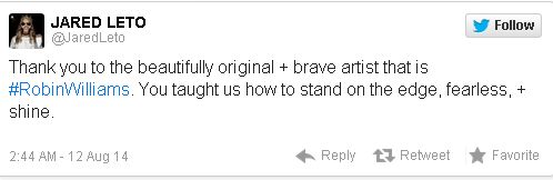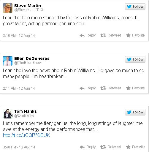 "Не мога да бъда по-шокиран от загубата на Робин Уилямс, невероятен талант, екранен партньор и нежна душа", написа Мартин.