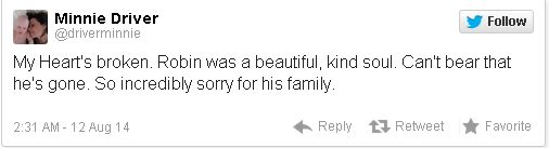 С Робин Уилямс се сбогува и актрисата Мини Драйвър, част от екипа на филма "Добрият Уил Хънтинг", донесъл Оскар на актьора за поддържаща роля през 1999 г.