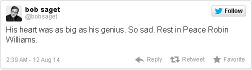 Култовият американски комик Боб Саген написа: "Сърцето му беше голямо, колкото и гения. Толкова съм тъжен. Почивай в мир Робин Уилямс."