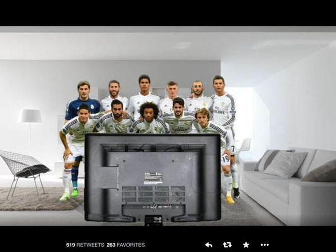 Текстът е съпроводен и със снимка-колаж на футболистите на Реал Мадрид, които са застанали пред голям телевизионен екран.