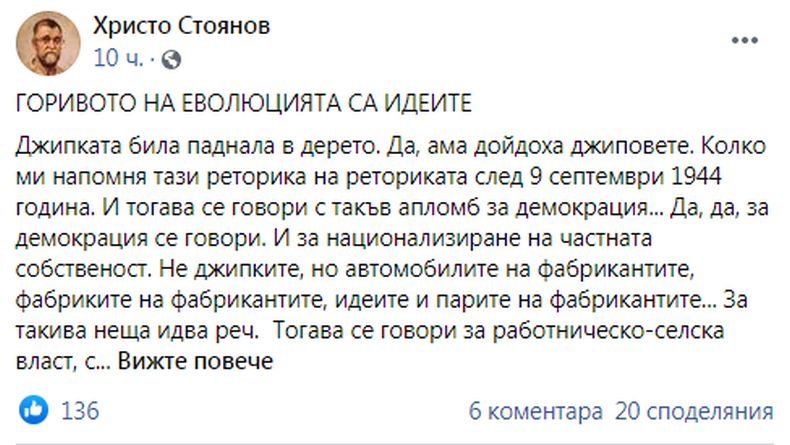 "Джипката била паднала в дерето. Да, ама дойдоха джиповете. Колко ми напомня тази реторика на реториката след 9 септември 1944 година." Това написа в профила си във "Фейсбук" писателят Христо Стоянов по повод дебелашкото изказване на Филип Станев от партята на Слави, че джипката паднала в дерето, идвала демокрацията. "Така че, Деветосептемврийци, хвърляйте джипките и да видим какви са ви идеите. И бъдете сигурни, че горивото на еволюцията не е нито дизелово, нито бензиново... Горивото на еволюцията са идеите", призовава Стоянов.
