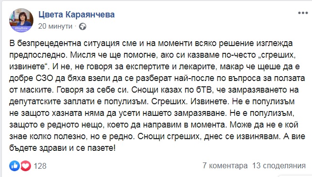 "И не, не говоря за експертите и лекарите, макар че щеше да е добре СЗО да бяха взели да се разберат най-после по въпроса за ползата от маските. Говоря за себе си. Снощи казах по бТВ, че замразяването на депутатските заплати е популизъм. Сгреших. Извинете. Не е популизъм не защото хазната няма да усети нашето замразяване. Не е популизъм, защото е редното нещо, което да направим в момента. Може да не е кой знае колко полезно, но е редно. Снощи сгреших, днес се извинявам. А вие бъдете здрави и се пазете!", написа още тя.