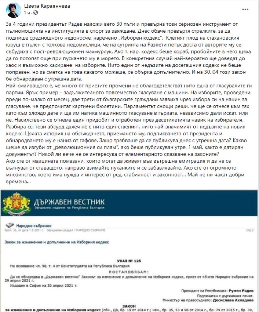 Депутатът от ГЕРБ Цвета Караянчева отправи тежки критики по адрес на президента Румен Радев и решението му да обнародва тайно и по нощите спорните промени в Изборния кодекс, които бяха прокарани в парламента в четвъртък вечерта.