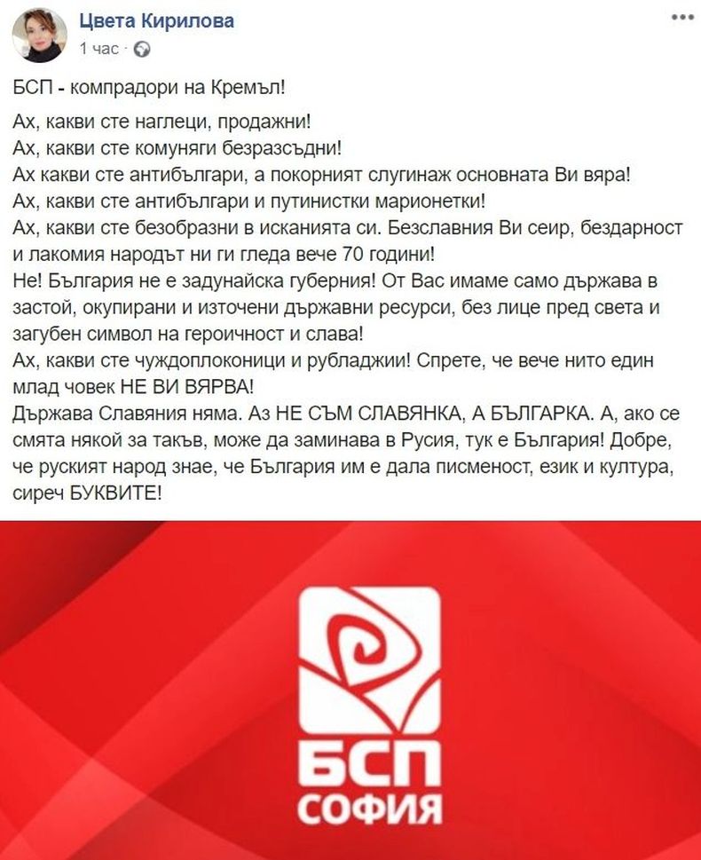 "БСП - компрадори (лица, които действат като агенти на чуждестранни организации - б.р.) на Кремъл! Ах, какви сте наглеци, продажни! Ах, какви сте комуняги безразсъдни! Ахq какви сте антибългари, а покорният слугинаж основната Ви вяра! Ах, какви сте родоотстъпници и путинистки марионетки! Ах, какви сте безобразни в исканията си. Безславния Ви сеир, бездарност и лакомия народът ни ги гледа вече 70 години!", възмути се Кирилова в социалната мрежа.