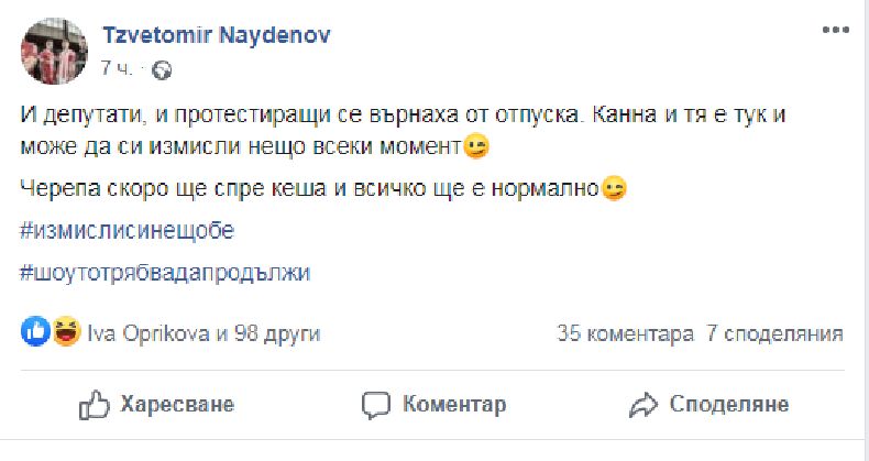 Цветомир Найденов взе на подбив метежа. Остро саркастично той се отнесе и към Васил Божков. "Черепа скоро ще спре кеша и всичко ще е нормално", написа той в профила си във "Фейсбук".