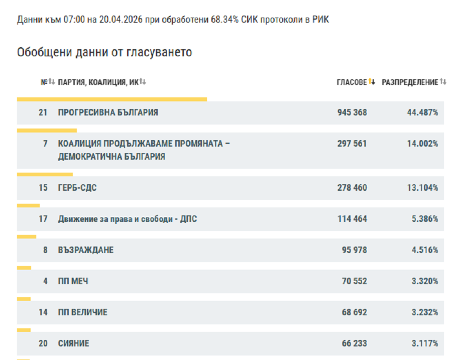 ЦИК публикува на сайта си междинни резултати при обработени 68,34% протоколи на секционните избирателни комисии (СИК) в районните избирателни комисии. Данните са към 7 часа тази сутрин.