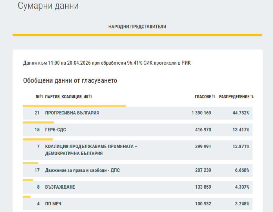 ЦИК публикува на сайта си нови междинни резултати при обработени 96.41% протоколи. Данните са към 11 часа тази сутрин.