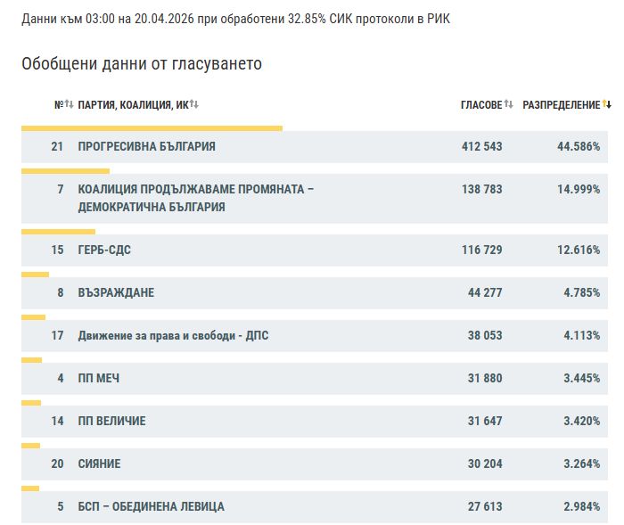 ЦИК публикува междинни резултати при обработени 32,85% протоколи на секционните избирателни комисии (СИК) в районните избирателни комисии (РИК). Данните са към 3:00 ч. Резултатите от изборите за народни представители за 52-рия парламент, произведени на 19 април, показват следното разпределение: