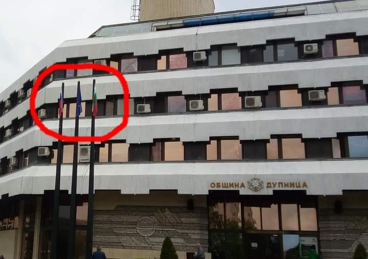 Голям цирк се разгра в Дупница днес. Руското знаме, издигнато редом с българския трибареник и флага на Европа на пилоните пред Общината в Дупница, предизвика скандал.