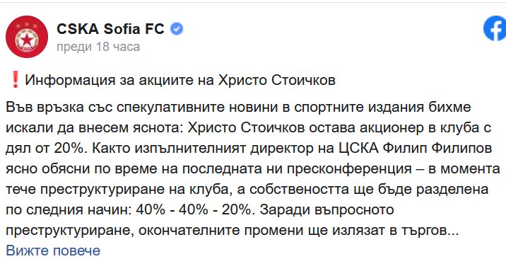 Във връзка със спекулативните новини в спортните издания бихме искали да внесем яснота: Христо Стоичков остава акционер в клуба с дял от 20%. Както изпълнителният директор на ЦСКА Филип Филипов ясно обясни по време на последната ни пресконференция – в момента тече преструктуриране на клуба, а собствеността ще бъде разделена по следния начин: 40% - 40% - 20%. Заради въпросното преструктуриране, окончателните промени ще излязат в търговския регистър на по-късен етап. Никога на дневен ред не е било премахването на най-голямата легенда на ЦСКА в лицето на Христо Стоичков от акционерите на клуба.