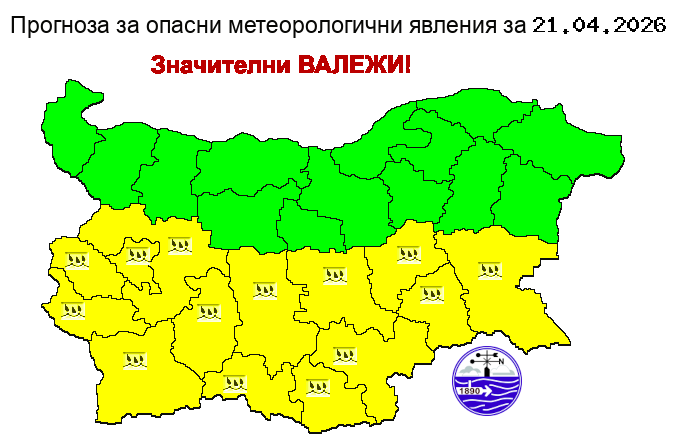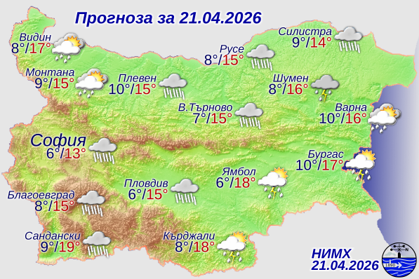 През днешния ден още преди обяд започналото от северозапад увеличение на облачността ще обхване цялата страна. Ще има валежи, интензивни и значителни на много места в Южна България, където ще са придружени и с гръмотевици. Вятърът ще се ориентира от северозапад, в Източна България от север-североизток, ще бъде слаб и умерен и с него ще прониква студен въздух. Максималните температури ще бъдат между 13° и 18°, в София – около 13°. Това съобщават от Националния институт по метеорология и хидрология (НИМХ).