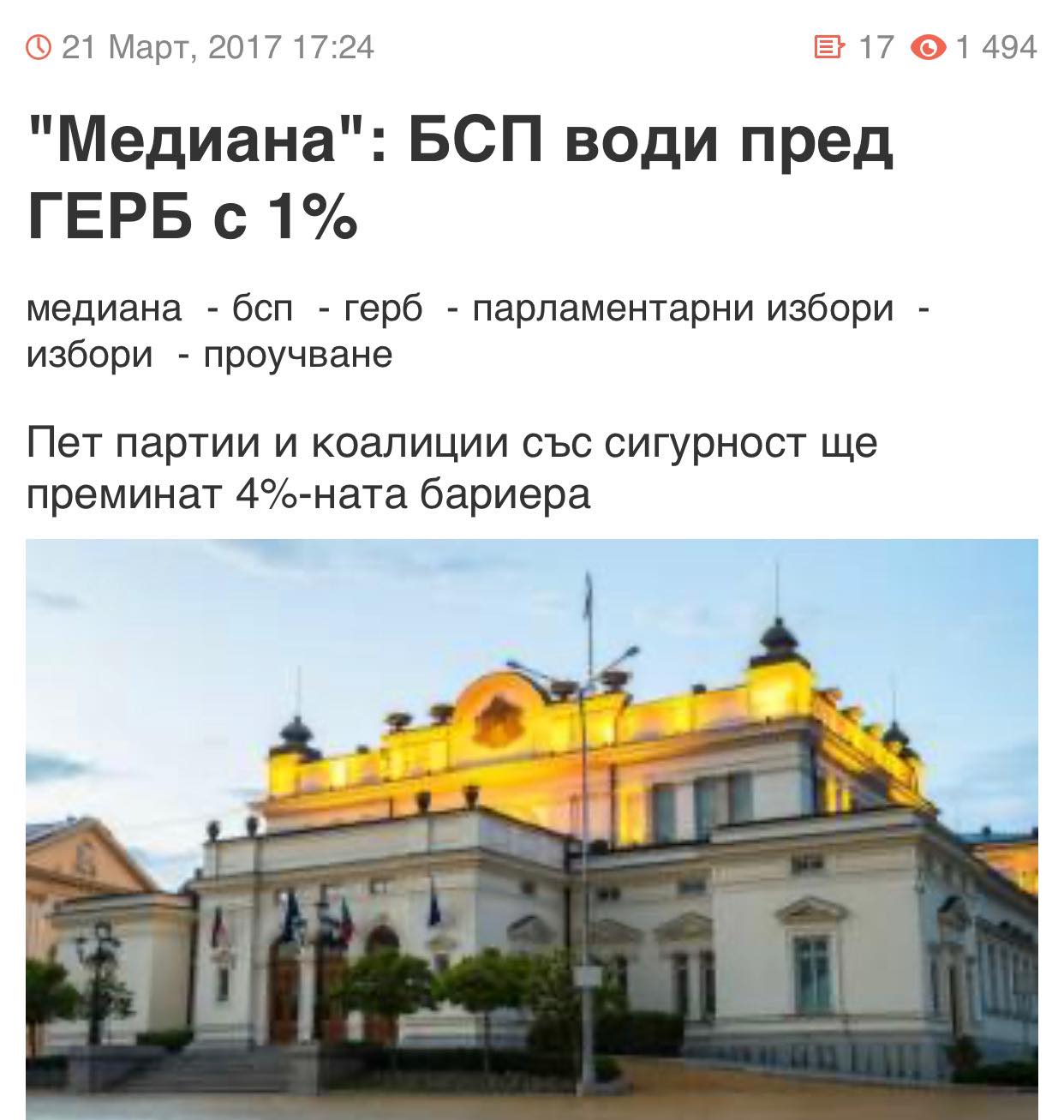 На 21 март 2017 г. "Медиана" пак измерва, че БСП води на ГЕРБ с над 1% за парламентарните избори, които са само след пет дни. В крайна сметка Борисов бие с над 5%.