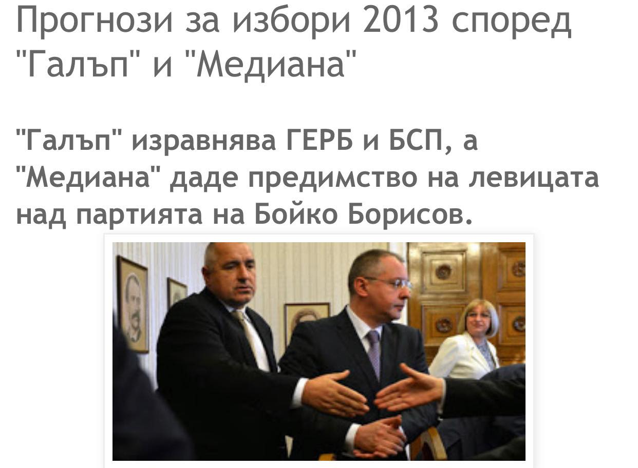 Месец преди парламентарните избори през 2013 г. "Медиана" измерва, че БСП ще бие ГЕРБ с над 1%. В крайна сметка партията на Борисов печели с 30 на 26.