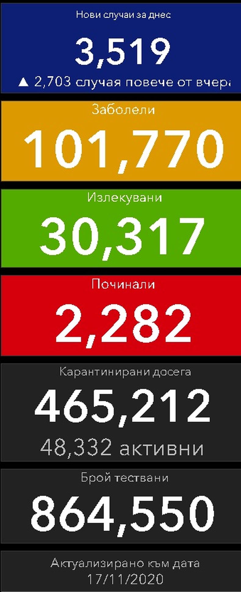 101 770 са вече положителните проби на заразени с коронавирус у нас. Това сочи справката на Единния информационен портал, обновен с данните от изследваните през вчерашния 16 ноември, видя ПИК. 69 171 са активните случаи към момента.