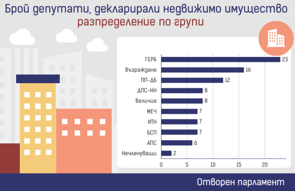 По отношение на парламентарните групи, очаквано най-много депутати от ГЕРБ-СДС са декларирали имоти - общо 23-ма. Това е ⅓-та от народните представители от най-многобройната група. За сравнение повече от половината от депутатите на МЕЧ и Величие са посочили някакво притежавано недвижимо имущество.