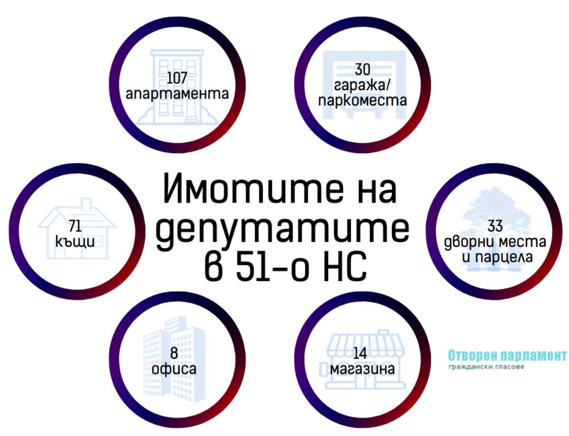 Съгласно декларираното пред Комисията за противодействие на корупцията става ясно, ч че народните представители са декларирали 107 апартамента, 71 къщи и 30 гаража. Част от тези имоти са наследствени, а друга – обявени като съсобственост със съпрузи и/или роднини на депутатите.