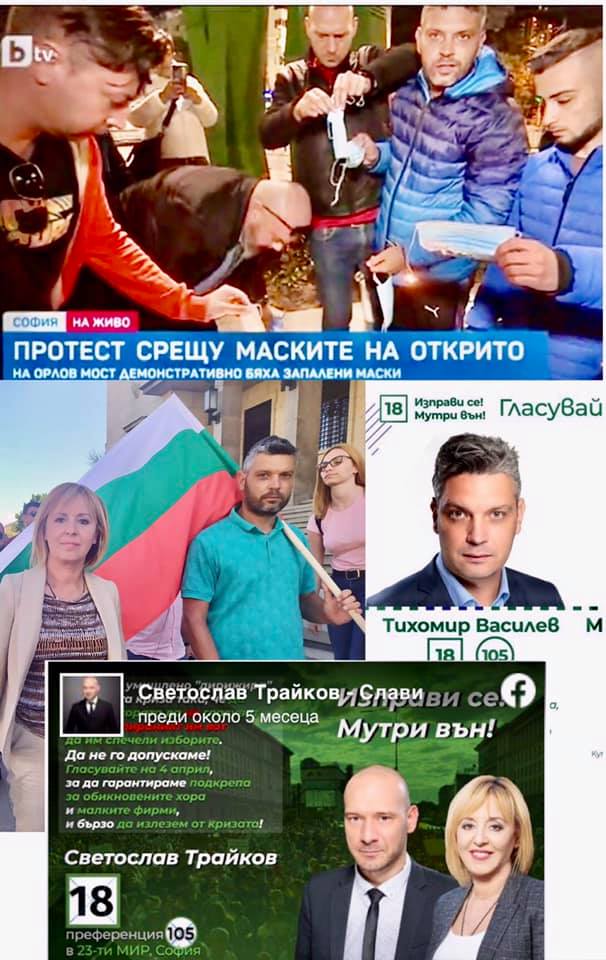 На тях се вижда как съпартийците на Манолова - Тихомир Василев и Светослав Трайков горят маски на Орлов мост. Материалът е излъчен по новините на bTV - https://btvnovinite.bg/amp/bulgaria/predpaznite-sredstva-na-otkrito-grazhdani-zapaliha-maski-v-znak-na-protest.html?fbclid=IwAR2VuqsGvDfI-6H4Cf4F_6Uy2TLCVg28PM1-a5CFX5gvDjR7IihsX93Z1MI.