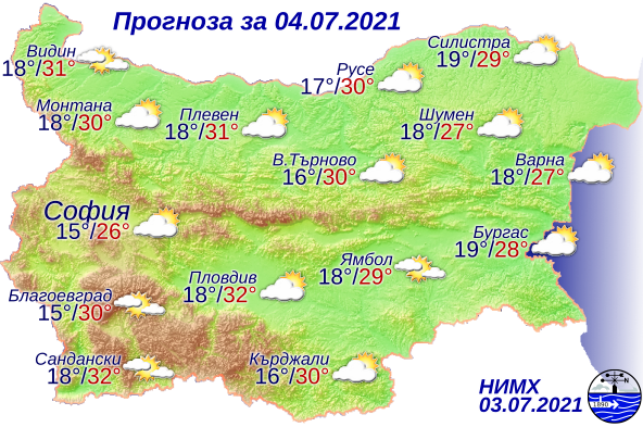 През неделния ден ще преобладава слънчево време. След обяд ще има временни увеличения на облачността, но само на отделни места, главно в планините, ще превали слабо. Ще е все още ветровито, с умерен северозападен вятър, който привечер ще отслабне. Дневните температури ще се повишат и максималните ще бъдат между 27° и 32°. Атмосферното налягане е близко до средното и слабо ще се понижи. Това съобщават от Националния институт по метеорология и хидрология (НИМХ).