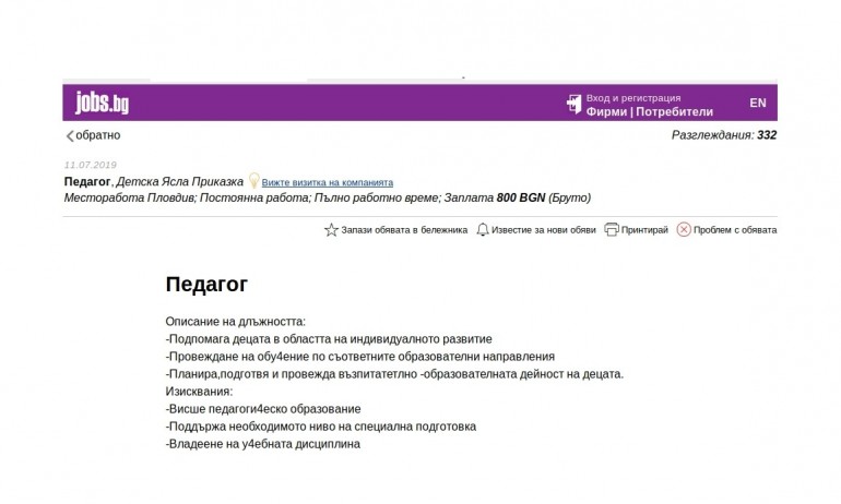Жена от Шумен попадна на крайно неграмотна обява за работа в сайт за трудова заетост. Жената и семейството и се местят в Пловдив преди няколко месеца. Докато жената търси нова работа по специалността си, намира обява от пловдивска ясла, в която търсят педагог, който да има „педагоги4еско висше образование“ и преди всичко да „владее у4ебната дисциплина“. Жената е изумена от неграмотността на институцията, която е отговорна за грижите на децата още от най-ранна възраст, съобщават от "Шуменонлайн.бг".