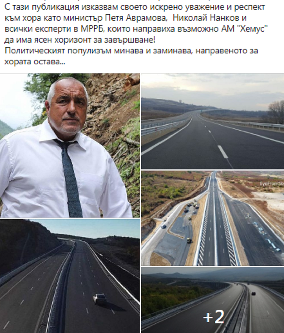 С тази публикация изказвам своето искрено уважение и респект към хора като министър Петя Аврамова, Николай Нанков и всички експерти в МРРБ, които направиха възможно АМ "Хемус" да има ясен хоризонт за завършване!