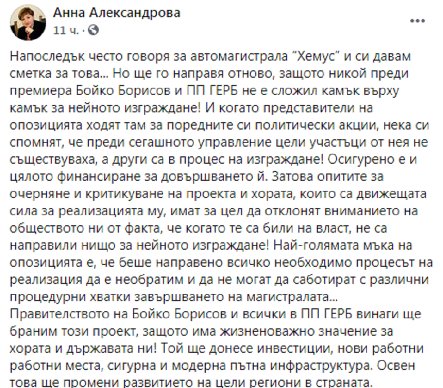 Никой преди премиера Бойко Борисов и ПП ГЕРБ не е сложил камък върху камък за изграждането на АМ "Хемус“! Това написа във Фейсбук депутатът и председател на правната комисия в парламента Анна Александрова.