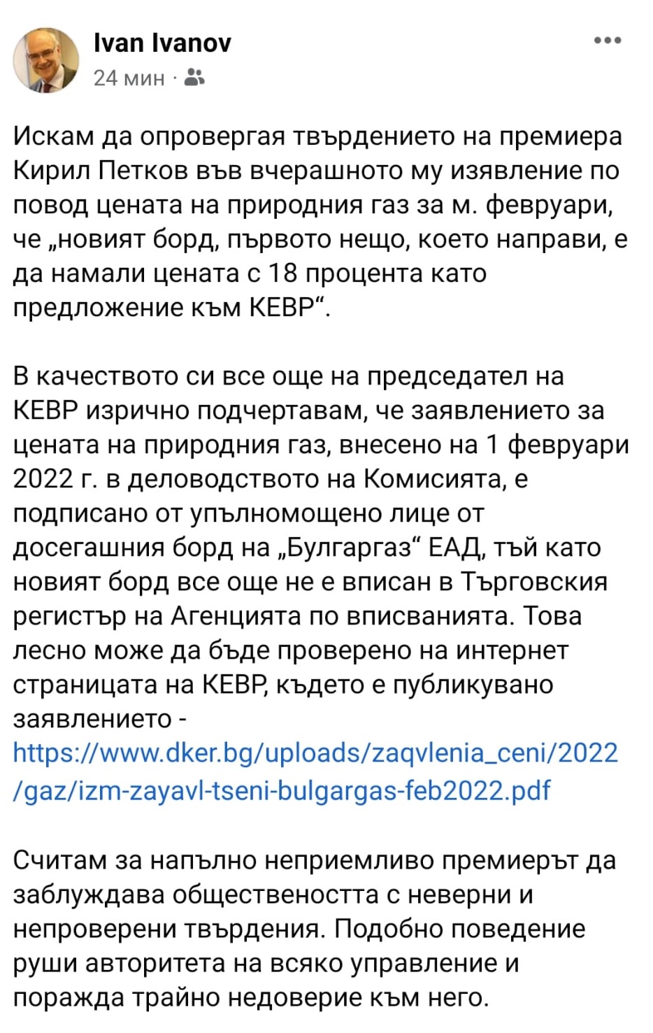 Искам да опровергая твърдението на премиера Кирил Петков във вчерашното му изявление по повод цената на природния газ за м. февруари, че „новият борд, първото нещо, което направи, е да намали цената с 18 процента като предложение към КЕВР. Това обяви на страницата си във Фейсбук председателят на КЕВР Иван Иванов.