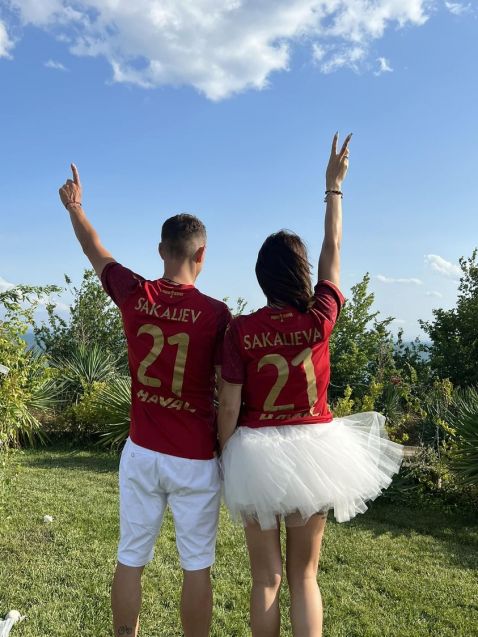 Щастливите младоженци позират и с футболни тениски с номер 21 под името "Sakalievi", предаде "Труд".