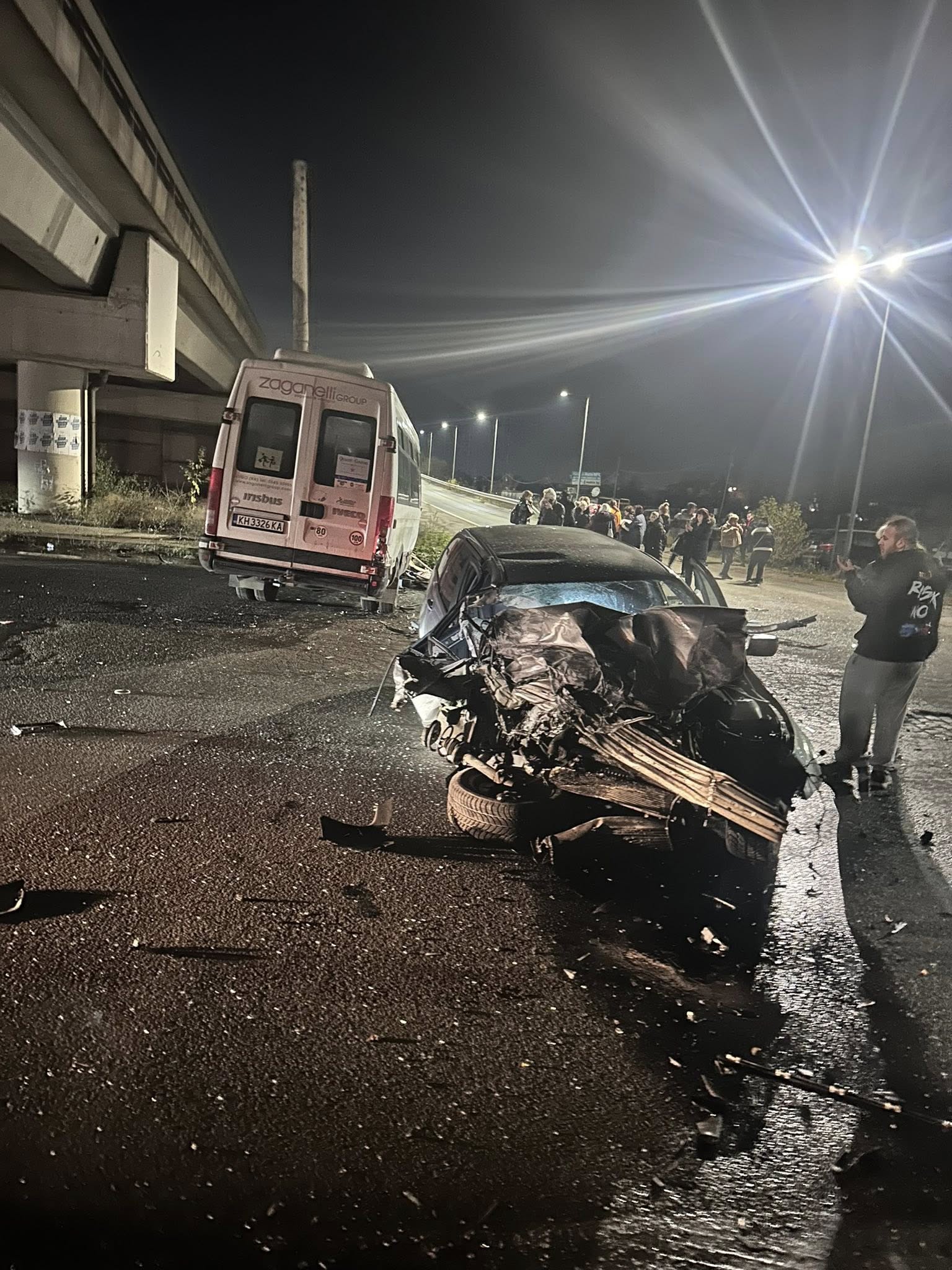 Кола с висока скорост е навлязла в насрещното движение и се е забила в бус с пътници.