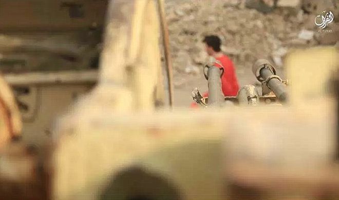 Шокиращото видео се появи в интернет, след като по-рано беше публикувана и публичната екзекуция на предполагаем "шпионин", който е пръснат на парчета с артилерийско оръдие близо до река Ефрат.