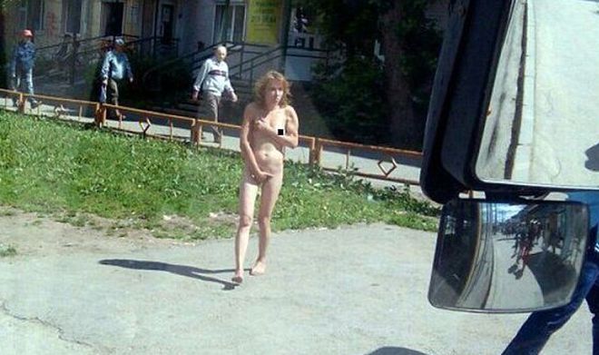 Очевидци заснеха с мобилните си телефони гола червенокоса красавица насред руския град Перм. Жената без особен успех се опитваше да скрие своите прелести, докато вървеше по натоварена улица.