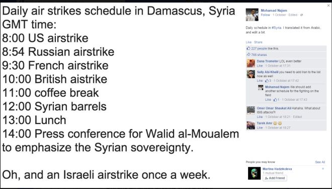 Ако не беше тъжно, щеше да е смешно. Вероятно това си казват повечето потребители на социалната мрежа, които от няколко дни неистово споделят "График на бомбандировките в Дамаск". Според разписанието първо започват въздушните удари от САЩ, следвани от Русия, Франция, Великобритания. Оставено е време и за кафе пауза.