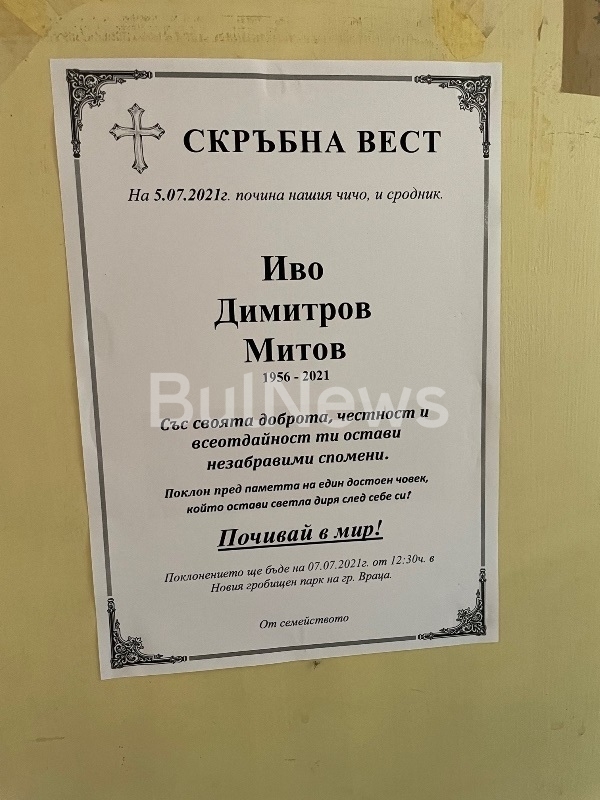 Труп на мъж е намерен в понеделник в блок на ул. „Найден Геров“ №8. Тялото е на 65-годишния Иво Митов. Той е живял в апартамент въх вход „А“ на 4-ия етаж. Починалият, който бил пенсионер по болест, обитавал жилището сам, като при него идвало момче, което му пазарувало хранителни продукти.