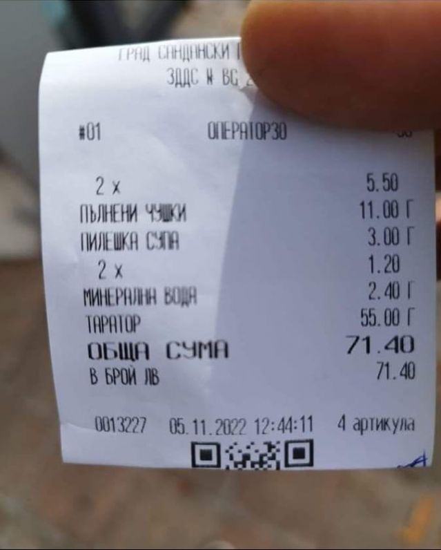 Касова бележка от заведение в Сандански подпали социалните мрежи. На фискалния бон се вижда, че клиентите са поръчали пилешка супа, два пъти пълнени чушки, две минерални води и таратор, а общата крайна сума е над 70 лева.