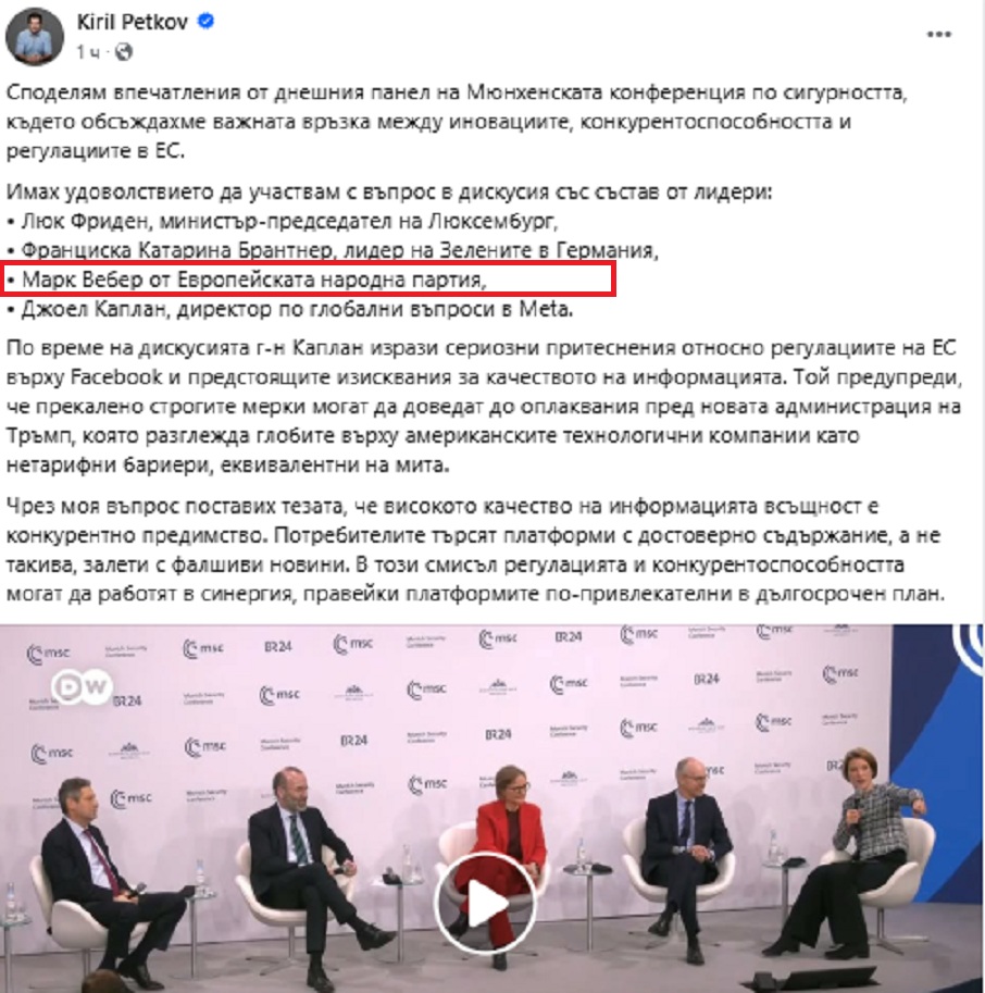 Невнятният Петков го удари на хвалба във Фейсбук, че е имал удоволствието да участва с въпрос в дискусията, с водещи панелисти Марк Вебер (според Кирчо Екскурзианта), Люк Фриден, министър-председател на Люксембург, Франциска Катарина Брантнер, лидер на Зелените в Германия и Джоел Каплан.
